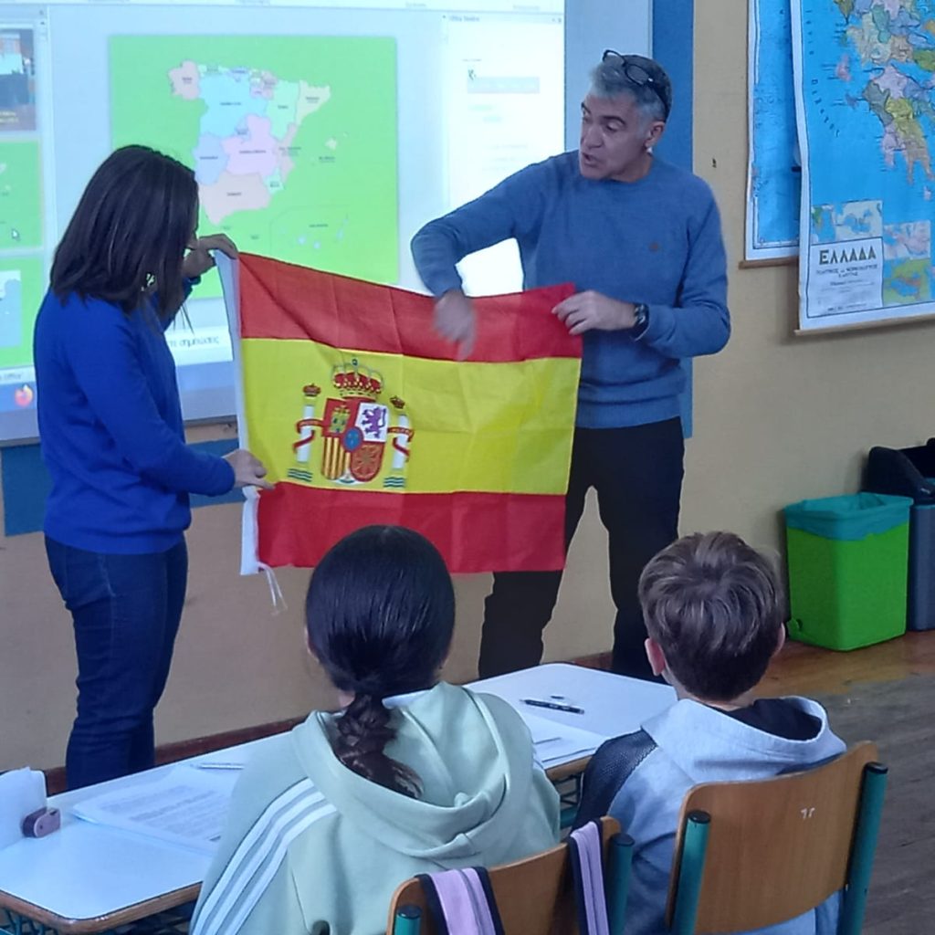 Την Τρίτη 26/11, οι μαθητές της Β’ και Γ’ τάξης υποδέχτηκαν τους Ισπανούς επισκέπτες με τραγούδια στα ελληνικά, αγγλικά και ισπανικά, τα οποία προετοίμασαν με τη μουσικό τους, Ίρις Παπακωνσταντίνου. Οι εκπαιδευτικοί παρουσίασαν το σχολείο, τη σημαία και την πόλη τους στις Ε’ και ΣΤ’ τάξεις, ενώ η Ε’ τάξη τραγούδησε τα παραδοσιακά κάλαντα της Ικαρίας και της Κρήτης. Στη συνέχεια, μαζί με την δασκάλα των Γερμανικών Αρετή Οικονομίδου, δημιούργησαν ένα ελληνοϊσπανικό τραγούδι με τη βοήθεια της τεχνητής νοημοσύνης, δοκιμάζοντάς το σε διαφορετικούς ρυθμούς όπως όπερα, ποπ και ραπ. Το απόγευμα, παρακολούθησαν τον όμιλο ρομποτικής του σχολείου με τον υπεύθυνο εκπαιδευτικό, Γιάννη Αρβανιτάκη.
